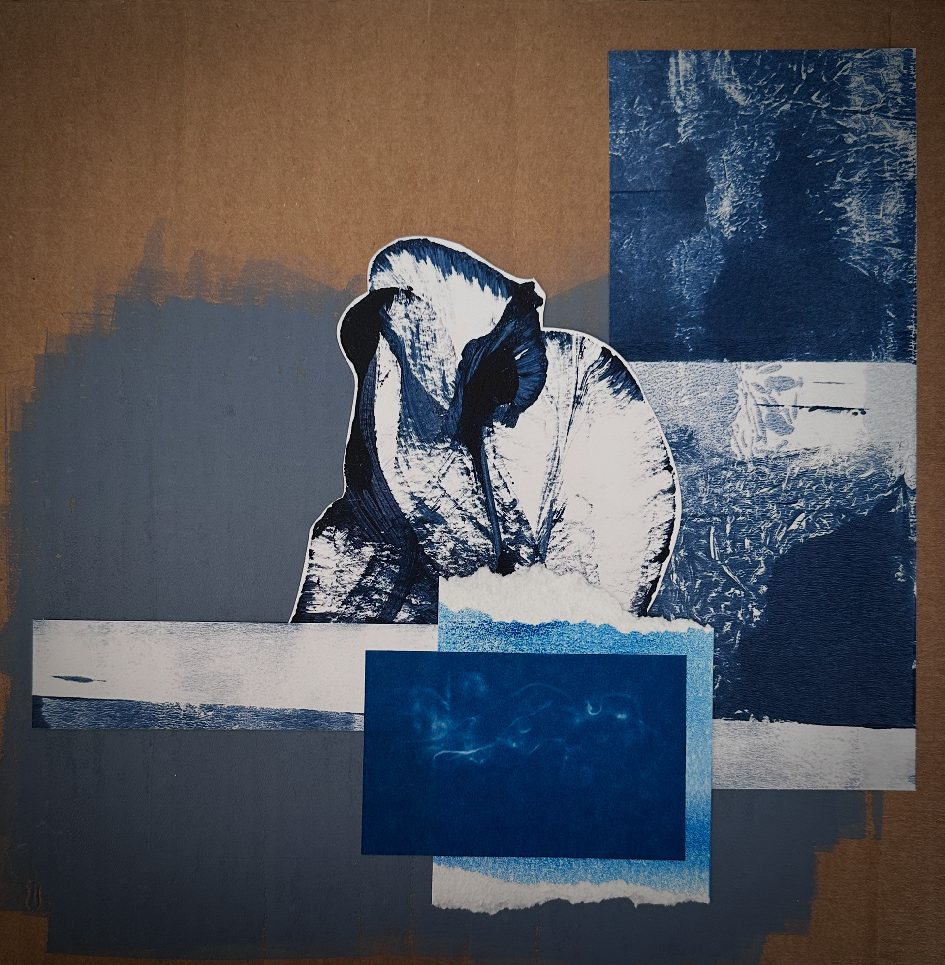 Collage made of various painting "scraps" I had in my studio. I seem to always gravitate towards blue. This piece combines a texture painting made with string, a few block prints and a solar cyanotype created with thread bundles mounted on recycled cardboard.